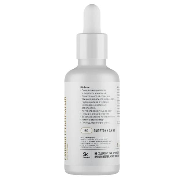 დაბალტემპერატურული გაშრობის მეთოდით მომზადებული Hericium erinaceus-ის ნაყოფსხეულების თხევადი ექსტრაქტი.
