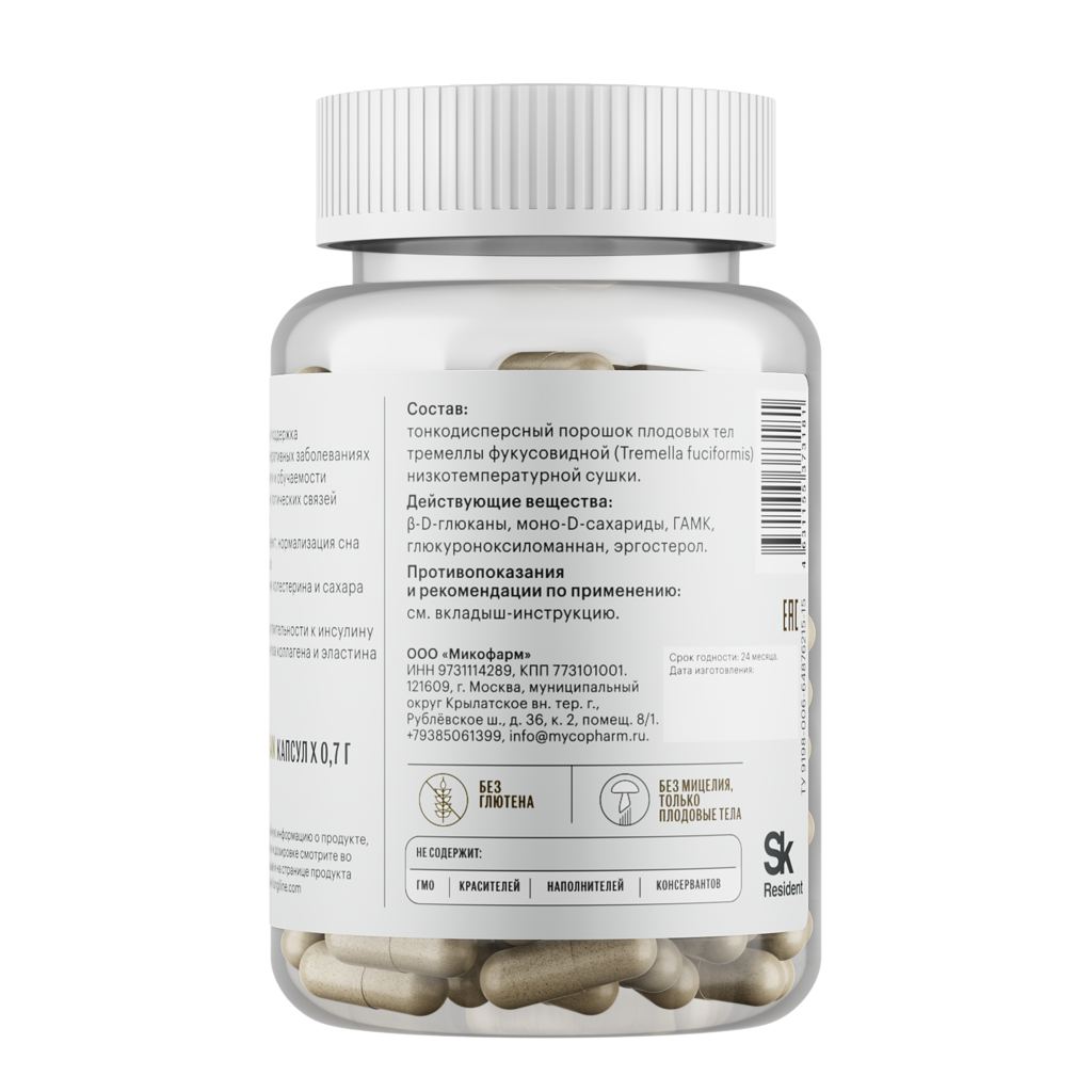 * შეიცავს: ტრემელას პოლისაქარიდებს, სუპეროქსიდდისმუტაზას, ვიტამინ D2